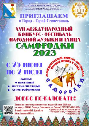 ХVII Международный конкурс-фестиваль народной музыки и танца "Самородки", Город-герой Севастополь, КрымХVII Международный конкурс-фестиваль народной музыки и танца"Самородки", Город-герой Севастополь, Крым О ХVII Международном конкурсе-фестивале народной музыки и танца «Самородки-2023, Город-герой Севастополь, Крым Культурный Комплекс "Корабел", город Севастополь Соучредители Фестиваля: - Департамент культуры города Севастополя; - Государственное бюджетное учреждение культуры города Севастополя «Культурный комплекс «Корабел». Партнеры Фестиваля: - Российский Клуб музыкантов - народников; - Дом офицеров Черноморского флота; - Муниципальное образование Нахимовского района города Севастополя; - Эко - парк «Лукоморье»; Цели и задачи Фестиваля: - укрепление мира и дружбы между народами, содействие взаимопониманию и взаимообогащению национальных культур, развитие любительского искусства и сохранение фольклорного наследия; - развитие культуры и народных музыкальных традиций разных стран, сохранение и пропаганда фольклорных сокровищ народного искусства; -популяризация русского культурного наследия, традиционного музыкального искусства; - обмен опытом работы творческих коллективов, укрепление творческих и научных контактов на взаимовыгодных условиях сотрудничества; Председатель жюри - Заслуженный артист Российской Федерации, президент Российского Клуба музыкантов-народников, артист, директор Квартета "СКАЗ" Дмитрий Белинский |